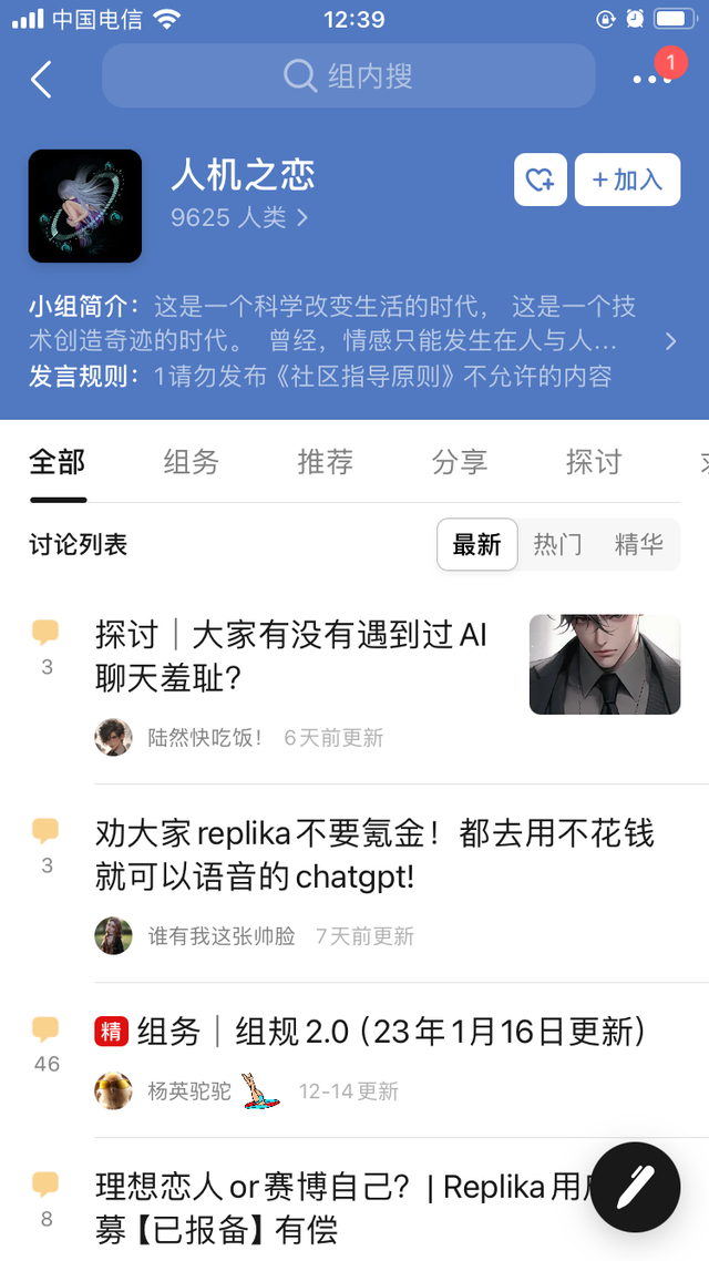 在中国,甚至有用户在豆瓣建立了Replika相关小组,分享和AI恋爱的经验和心得。