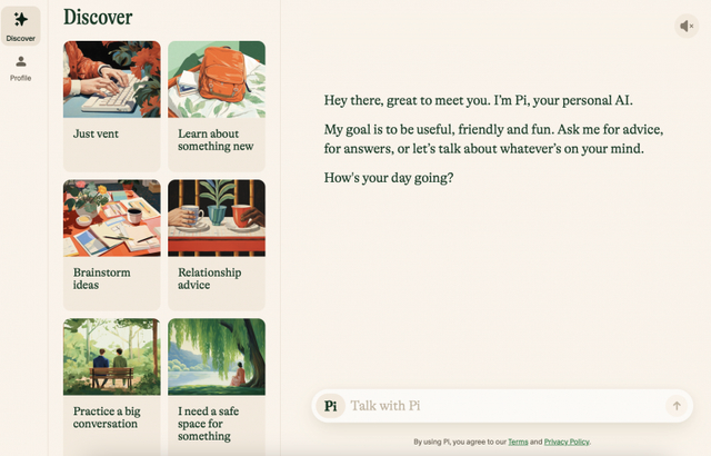 与ChatGPT这种以任务导向型为主的机器人不同,Pi的主要功能是与用户进行情感交流,它不能生成代码、不能写论文、不能写策划方案,更像是一个倾听者,一个陪伴在侧的亲近朋友。