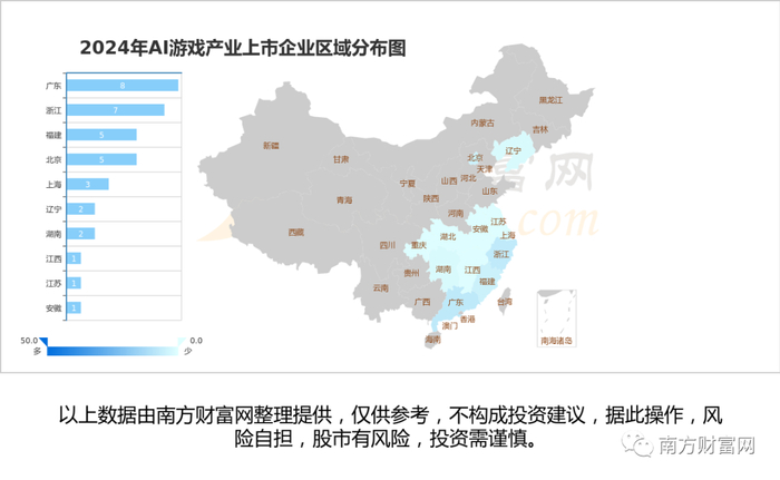 从上市公司地区的分布情况来看,A股37家AI游戏相关上市公司分布在广东、浙江、北京、福建、上海等省市,总体来看主要集中于华东区域。