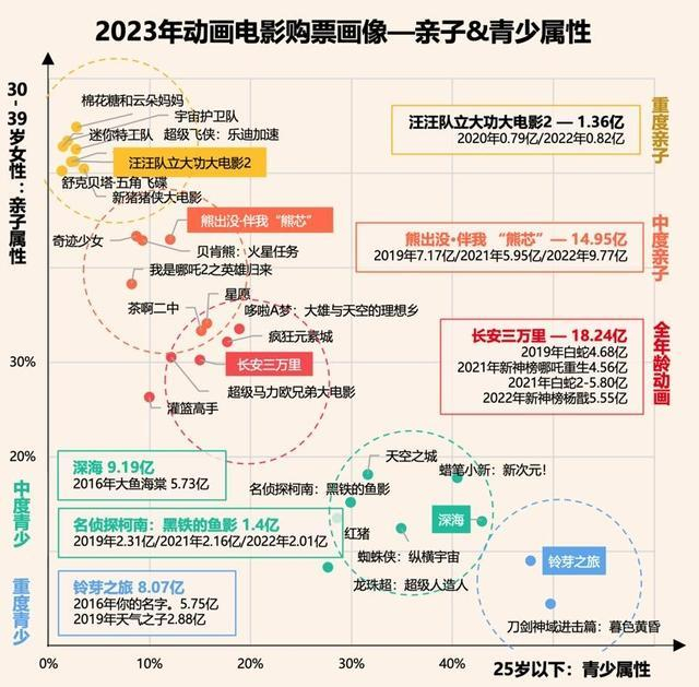 此外,报告还结合购票用户画像,对2023年动画电影进行亲子和青少年属性的拆分,可以看到,基本上各类电影都有进一步的代表作。