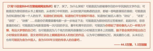 该片用唐诗串起了一个个熟悉的人物,将那个遥远又绚烂的盛世展现在观众眼前,引发不同年龄段观众的文化认同和情感共鸣。有网友表示,“那些年少时囫囵吞下的诗句,却在某时某刻击中了你”。
