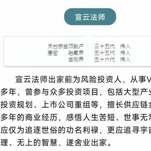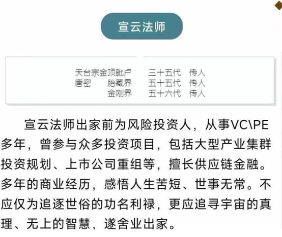 宣云大师的个人简历中写到,“法师出家前为风险投资人,从事VC/PE多年,曾参与众多投资项目……多年商业经历感悟到世事无常,不应追逐世俗利禄,遂舍业出家”。
