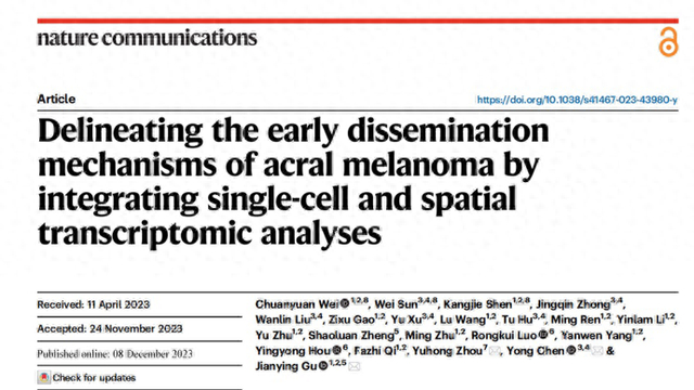 日前,复旦大学附属中山医院党委书记顾建英教授团队联合周宇红教授团队以及复旦大学附属肿瘤医院陈勇教授团队,在国际知名期刊《Nature Communications》上在线发表研究成果。该研究通过单细胞联合空间转录组技术,在国际上首次刻画了肢端恶黑淋巴结转移的时空图谱,为肢端恶黑淋巴结转移的分子机制及干预靶点提供丰富的数据和理论基础。