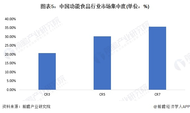 市场集中度方面,中国功能食品行业市场集中度整体处于较低水平,CR3为20.8%,CR5为30.2%,CR5约35.8%。
