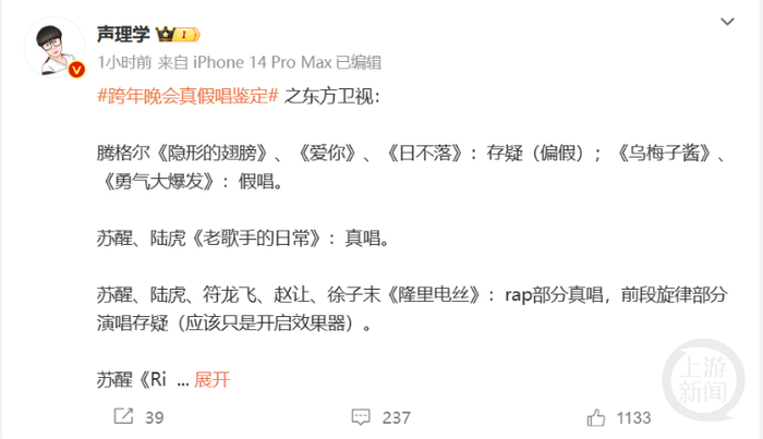 除了腾格尔之外,“声理学”还表示,黄明昊的《一人之众》是假唱,田曦薇、丞磊的《甜甜的》是假唱,王子浩的《A·I.BAE》是假唱,BOYHOOD的《园地登陆》是假唱,胡歌、唐嫣的《再回首》是假唱,唐九洲、曹斐然、张婉清的《晚风遇见你》是假唱。黄龄的《王招君》被指出如果是直播表演就是假唱;如果是录播表演就有可能只是做过后期。