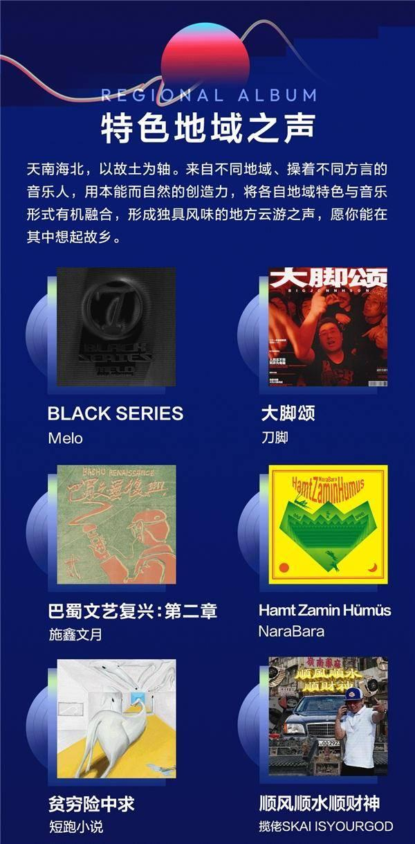 另外,在本地化音乐浪潮愈发兴起的时代,「特色地域之声Regional Album」类别入选的作品来自祖国四面八方,分别是:Melo《BLACK SERIES》、刀脚《大脚颂》、施鑫文月《巴蜀文艺复兴:第二章》、NaraBara《Hamt Zamin Hümüs》、短跑小说《贫穷险中求》和揽佬《顺风顺水顺财神》。