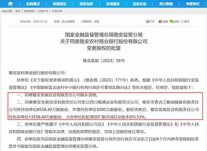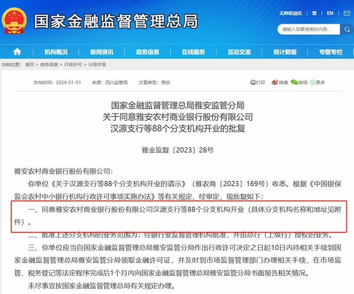 1月3日上午,国家金融监管总局网站披露,四川监管局批复同意雅安农村商业银行股份有限公司(简称“雅安农商行”)注册资本由10.56亿元变更为24.5亿元、同意雅安发展投资有限责任公司(简称“雅安发展”)股东资格、同意雅安农商行汉源支行等88个分支机构开业。