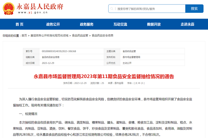 本次抽检的食品包括食用农产品、调味品、蔬菜制品、糖果制品、罐头、蛋制品、食糖、粮食加工品、淀粉及淀粉制品、糕点、水果制品、肉制品、豆制品、酒类、饮料、餐饮食品、饼干、炒货食品及坚果制品、薯类和膨化食品、食品添加剂、食用油、油脂及其制品等共283批次,经永嘉县食品药品检验中心和浙江宏正检测有限公司检验,结果合格282批次,不合格1批次。