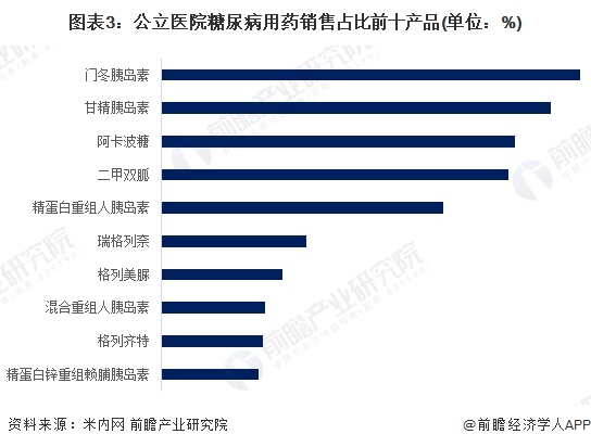 从糖尿病用药市场份额来看,根据米内网的统计数据,门冬胰岛素是目前公立医院应用最为广泛的糖尿病用药,目前市场占比为13.2%;甘精胰岛素排名第二,销售占比为12.2%;阿卡波糖排名第三,销售占比为11.1%。