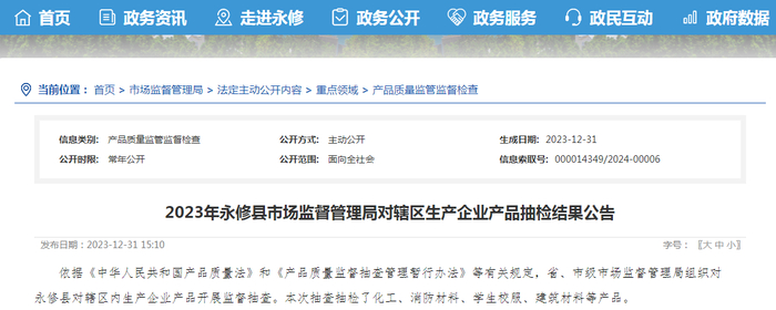 2023年江西省永修县市场监督管理局对辖区生产企业产品抽检结果公告