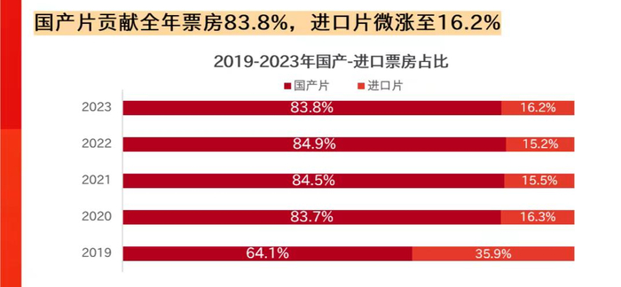 伴随市场回归常态,电影行业也出现新的变化趋势。首先,在供给端,国产片成为电影院的绝对主角。《报告》显示,2023年国产片占总票房83.8%,全年票房过亿元影片共73部,其中国产影片50部,年度票房前10名的影片也均为国产片;相较之下,进口片2020年后日渐式微,仅占全年票房的16.2%。