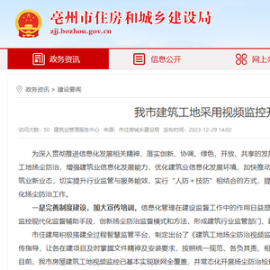 市住建局积极搭建全过程智慧监管平台,制定出台了《建筑工地扬尘防治视频监控安装标准》,在日常检查中,亳州市住房和城乡建设局对符合安装条件及新开工项目及时进行宣传指导,让各在建项目及时掌握文件精神及安装要求,按照统一规范、各负其责、相互配合的原则,系统谋划、统筹部署,健全保障举措,增强整体性和协同性,目前,亳州市房屋建筑工地视频监控已基本实现联网全覆盖,并常态化开展扬尘防治检查工作。