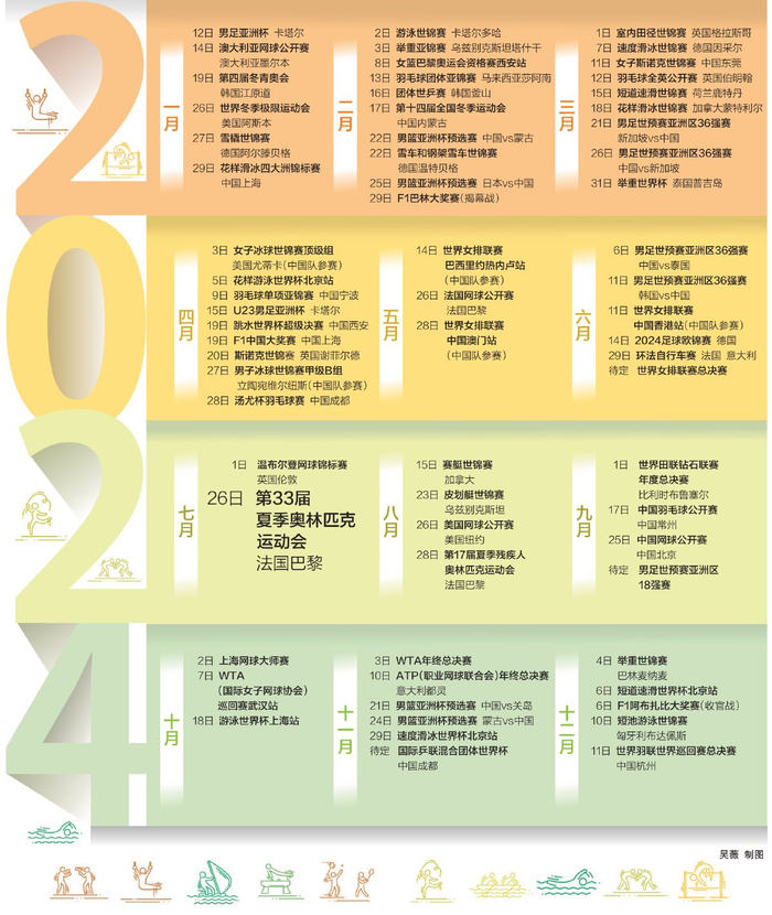 2024年是“体育大年”,除了世界上规模最大的综合性运动会——第33届夏季奥运会将在法国巴黎举行之外,单项世界顶级赛事也将接二连三上演。我国多个城市将举办国际赛事,中国的体育爱好者不仅可以通过网络、电视追赛,更可以亲临现场为运动员们呐喊助威。