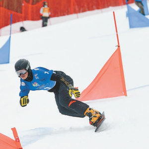 2023-2024赛季全国单板滑雪平行项目锦标赛暨十四冬资格赛在河北承德举行,图为彭玥熙在比赛中。 新华社发