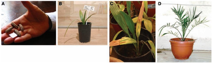 图 32 千年前的种子长出的枣椰树(A:种子;B:生长 3 个月后达到 15 厘米;C:生长 7.5 个月达到 31 厘米;D:生长 26 个月达到 121 厘米) 图片来源:参考文献2