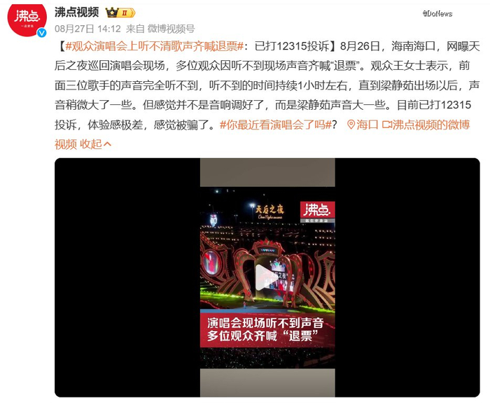 甚至,连热门城市也容易翻车。海南省会海口自五源河文化体育中心建成后,近年来已经成为不少一线歌手巡演的必经之站。即便如此,去年请来许美静、周慧敏、郑秀妍、蔡健雅、梁静茹、孙燕姿六位歌手举办“天后之夜”,现场音响效果竟然差到全场大喊“听不清”、“退票”,好生尴尬。