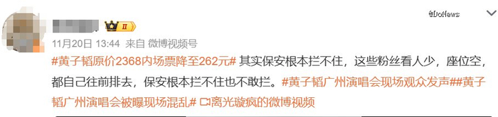 11月20日,“黄子韬原价2368内场票降至262元”的话题冲上了热搜*。有网友晒出截图,其广州站演唱会原本为2368元的内场票,在二级票务平台却降到了262元,比*价368元的看台票还便宜。场馆外,还有0元送票的火爆场面。原定连开两场的黄子韬,最终以“健康原因”取消了其中一场。