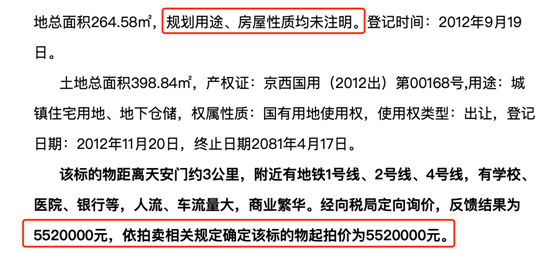 直至2023年10月的第四次挂牌,起拍价降至552万元,保证金也变成了110万元。竞买公告给出的理由是,经向税(务)局定向询价,反馈结果为552万元,依拍卖相关规定确定该标的物起拍价为552万元。
