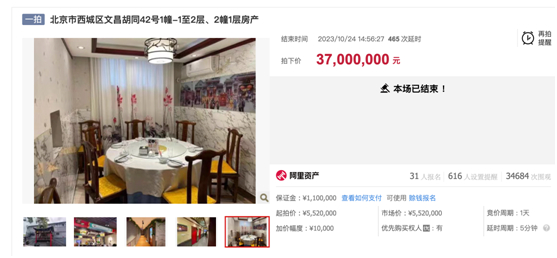 2023年10月24日14时56分,在经历465次延时和533次竞价后,熊鹰(上一次竞得者)以3700万元拿下这套房产。