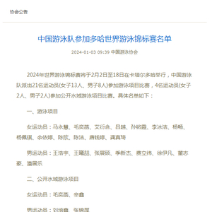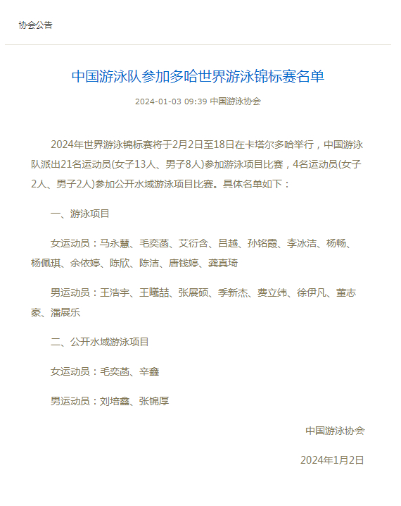 1月3日,中国游泳协会官方网站公布了征战2月份多哈游泳世锦赛的运动员名单,张雨霏、覃海洋、汪顺、叶诗文、徐嘉余等多位奥运冠军、世界冠军均不在这份名单中。今年是奥运年,中国游泳队显然是把重要战略目标放在了全力备战7月的巴黎奥运会上,毕竟奥运会才是2024年的关键一战。