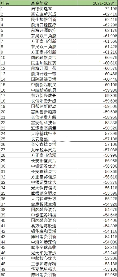 2021-2023基金跌幅排行榜,诺德优选排名第一,三年跌了72%。