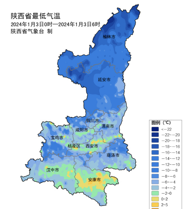今晨(截至06时)陕北北部、关中南部和陕南大部最低气温较昨晨下降2~6℃,全省共90个区县1902监测站最低气温低于0℃,最低气温分布:陕北-22~-2℃,最低神木市红碱淖站-22.3℃;关中-14~4℃,最低千阳高崖站-14.0℃,西安站0.1℃;陕南-12~5℃,最低留坝宽沟站-11.8℃。