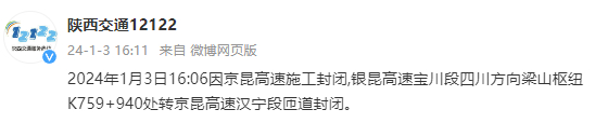 陕西交通12122:2024年1月3日16:06因京昆高速施工封闭,银昆高速宝川段四川方向梁山枢纽K759+940处转京昆高速汉宁段匝道封闭。