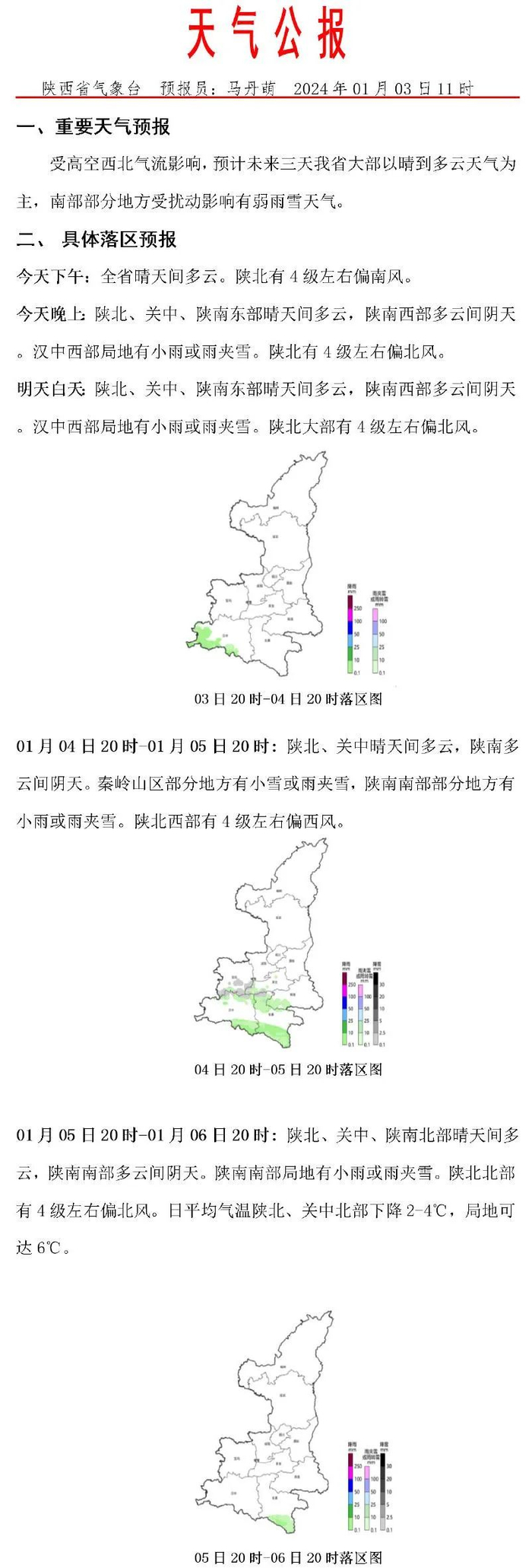 4日:陕北、关中、陕南东部晴天间多云,陕南西部多云间阴天。巴山部分地方有小雨或雨夹雪。陕北有4级左右偏北风。日平均气温陕北北部下降4℃左右。