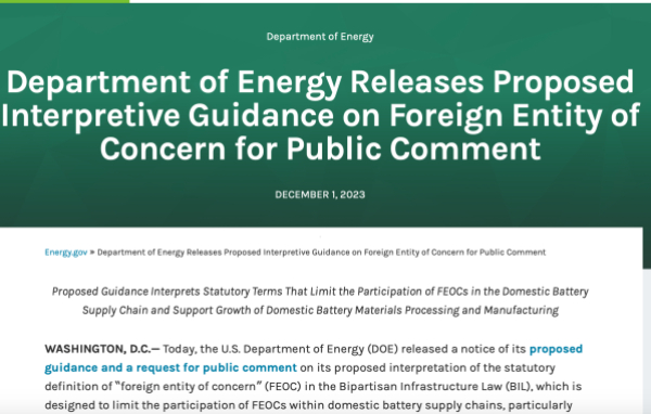 2024年1月1日,美国能源部(DOE)于去年12月发布《两党基础设施法》中“敏感外国实体(FEOC)”的解释文件、美国财政部(Treasury)和国税局(IRS)发布的《通货膨胀削减法》(IRA)第30D条清洁能源车辆税收抵免相关禁令的指导意见正式生效。
