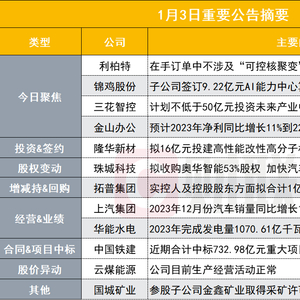 大北农公告,公司副董事长张立忠及其一致行动人王丽娜1月2日通过深交所交易系统以集中竞价交易方式分别增持公司股份50万股,合计增持100万股,占公司当期总股本的0.02%。