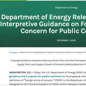 2024年1月1日,美国能源部(DOE)于去年12月发布《两党基础设施法》中“敏感外国实体(FEOC)”的解释文件、美国财政部(Treasury)和国税局(IRS)发布的《通货膨胀削减法》(IRA)第30D条清洁能源车辆税收抵免相关禁令的指导意见正式生效。