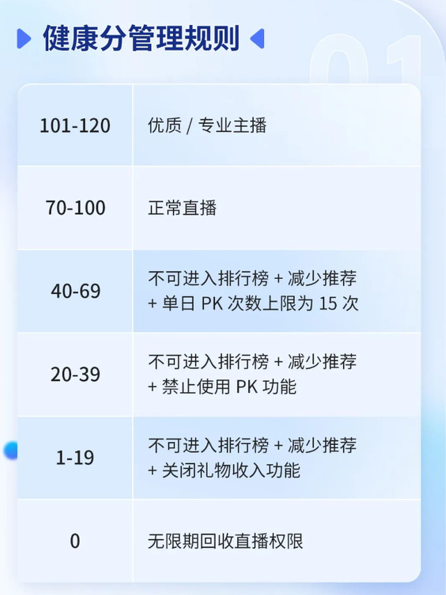据介绍,“健康分”制度于2023年9月开始试运行,平台根据主播日常直播行为增减账号“健康分”,并依据分值对账号分级定档,对应不同的长效管理措施。在这一制度约束下,总分低于70分的主播,会被减少推荐且限制单日PK次数,低于40分则禁止使用pk功能,如果低于20分,在此基础上还将失去礼物收入功能,0分主播则将被永久回收直播权限。