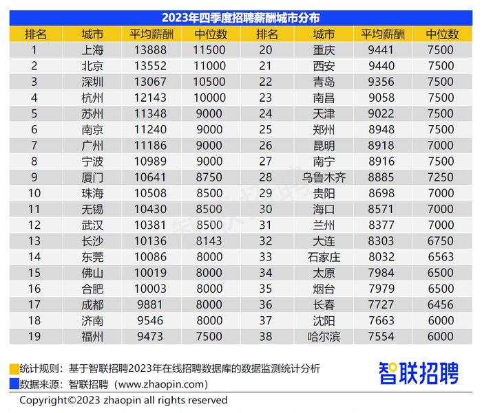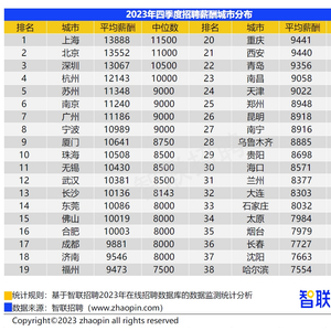 上述报告统计,上海以13888元平均月薪位居榜首,连续四个季度位居第一;北京以13552元平均月薪排名第二;深圳位列第三,平均招聘月薪13067元;杭州位列第四,平均招聘月薪12143元。