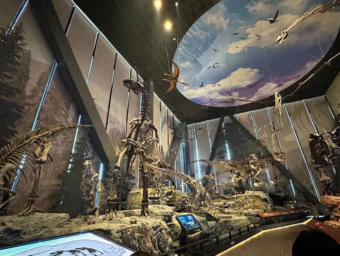 走进中国古动物馆的恐龙帝国展厅,映入眼帘的沧龙化石模型悬吊在空中,两侧墙体上极富视觉张力的彩绘,生动再现了亿万年前的地球记忆。置身其中,鲜活生动的场景让人们仿佛回到了侏罗纪时代。