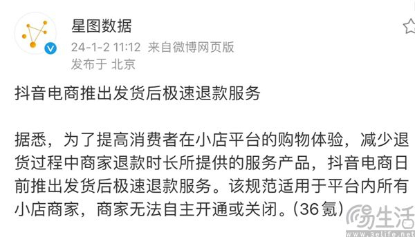 质疑拼多多、理解拼多多,成为拼多多,这俨然成为了如今电商行业的新风尚,继此前的淘宝和京东之后,抖音电商也加入了“仅退款”的行列。根据官方公布的信息显示,为提高消费者在抖音平台的购物体验,减少退货过程中商家退款时长所提供的服务产品,抖音电商推出发货后极速退款服务,并且该规范适用于抖音平台内所有小店商家,商家将无法自主开通或关闭。