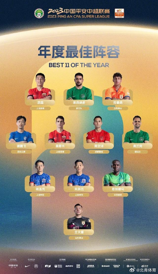 本次评选产生的年度最佳阵容具体为:王大雷(山东泰山)、蒋圣龙(上海申花)、朱辰杰(上海申花)、恩加德乌(北京国安)、谢鹏飞(武汉三镇)、奥斯卡(上海海港)、周定洋(成都蓉城)、弗兰克(浙江队)、武磊(上海海港)、莱昂纳多(浙江队)、克雷桑(山东泰山)。