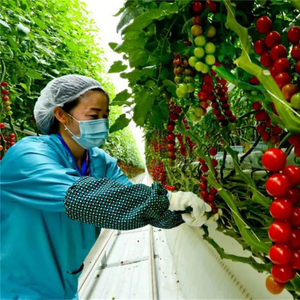 肃州区戈壁生态农业产业园里工人拉枝管理。