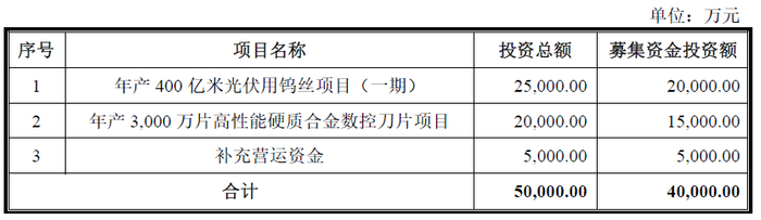 注:“年产400亿米光伏用钨丝项目(一期)”为120亿米。