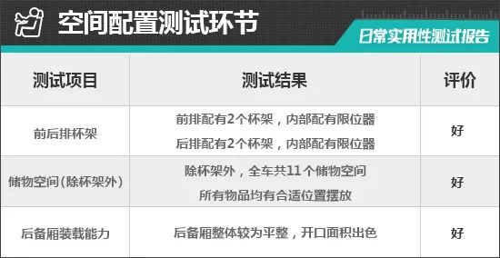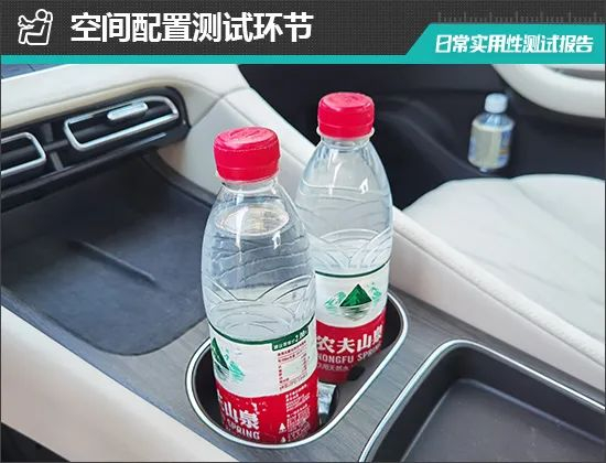 对于车内使用空间的测试,只针对前排触手可及的空间,不包括手套箱、中央扶手箱等需开启的空间。测试方法是将以下固定物品全部放置在前排的各个储物空间内,通过固定物品的放置情况来判断车辆储物空间的表现。测试选定的固定物品为:2瓶常规大小的矿泉水、1部大屏手机、1支口红、1个挎包、1副墨镜、1把折叠雨伞以及1包常规尺寸的抽纸。
