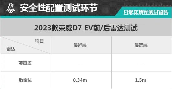 在测试过程中,倒车雷达在1.5m处可感应到后方物体,持续蜂鸣阶段距离为0.34m。参考往期测试经验,持续蜂鸣阶段越接近0.25m则越贴近日常使用习惯。从实测数据来看,测试车辆持续蜂鸣提示距离与测试经验值还有差距。