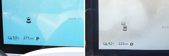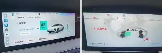 此外,对于充电效率我们也进行了测试,实测使用快充桩充电10分钟,电池电量从42%增加到46%,电池电量增加了4%,续航里程增加27km,预计其充满电的用时与系统预估用时略有差距。