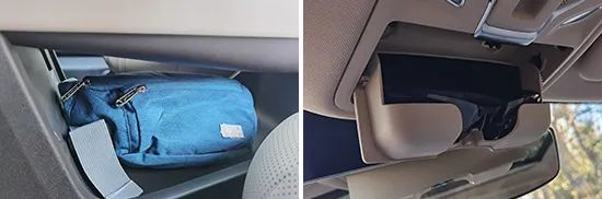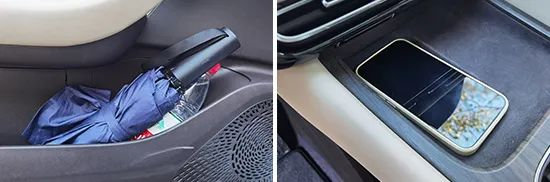 经过实测,上述固定物品都能合理地放置在前排各个储物空间内。2023款荣威D7 EV的前排中央通道下方进行了掏空处理,形成的储物空间容积非常可观,可放置常规尺寸的挎包。此外,该车杯架前后方均配有储物格,可放置小型物品。值得一提的是,车辆内部还配备了眼镜盒,且底部还采用了绒布处理,细节考虑周到。