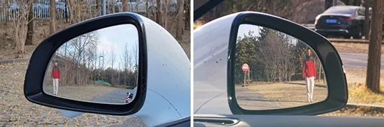 外后视镜视野范围测试时,首先让测试人员分别站在左右后视镜垂直10m处,随即开始向左右两侧移动,直至出现在两侧后视镜最外侧边缘为止,测出其横向距离。随后通过公式计算,便可以得出后视镜视野范围的夹角角度。角度越大则后视镜视野盲区范围越小,反之则后视镜视野盲区越大。