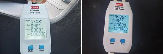 同时,我们对USB接口的电压与电流进行了测试,前排接口的电压电流分别为5.08V,0.46A。后排接口的电压电流分别为4.96V,1.85A。此外,该车前排USB Type-C接口上方配备了1个12V电源接口,方便为车内其它设备充电。