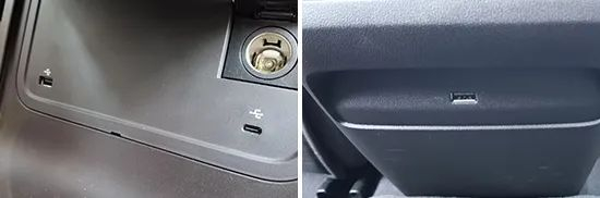 在车内USB接口方面,测试车辆的前排配备了2个USB Type-A和1个USB Type-C接口,其中前排贯穿式储物格内配有1个USB Type-A和1个USB Type-C接口,内后视镜后方配有1个USB Type-A。在后排,该车配备了一个USB Type-A接口,位于后排空调出风口下方。