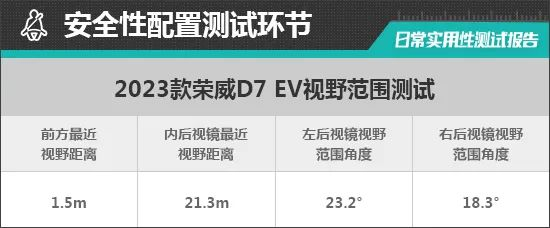 通过测试可以发现,2023款荣威D7 EV总体表现值得肯定。尤其是车内多个储物格可放下全部测试物品,日常使用较为便利。此外,该车的语音交互能力也很强大,响应和执行速度较快,智能化表现出色。但不足之处在于,该车内后视镜后方视野距离和左/右外后视镜视野范围存在较大盲区,同时,后方雷达持续蜂鸣也与测试经验值存在差距。总的来说,2023款荣威D7 EV如果在细节方面稍作提升,表现则会更加出色。