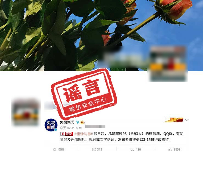 ☞ 经调查,央视新闻官方并未发布过类似内容,网传图片为合成图片。微信团队会根据用户投诉,视具体异常行为及违规程度进行区分,对违规行为采取梯度处置,包括警告、封禁功能、封禁账号等处理方式。
