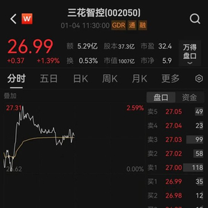 1月4日午盘,三花智控股价上涨1.39%,最新市值为1007亿元。