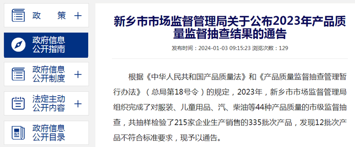 根据《中华人民共和国产品质量法》和《产品质量监督抽查管理暂行办法》(总局第18号令)的规定,2023年,新乡市市场监督管理局组织完成了对服装、儿童用品、汽、柴油等44种产品质量的市级监督抽查,共抽样检验了215家企业生产销售的335批次产品,发现12批次产品不符合标准要求,现予以通告。