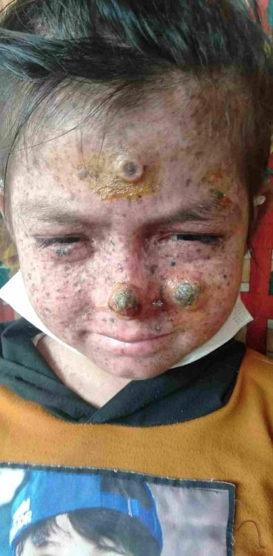 出生时小古丽皮肤白皙,但没过多久,女孩脸上开始出现小斑点,随后斑点越来越多,逐渐扩展到整个面部,颈部和躯干四肢,面部出现多个可怕的肿块,对紫外线更是极度敏感。父母意识到问题的严重性,去年1 1 月带着小古丽至新疆喀什地区第二人民医院(简称“喀什二院”)就诊。
